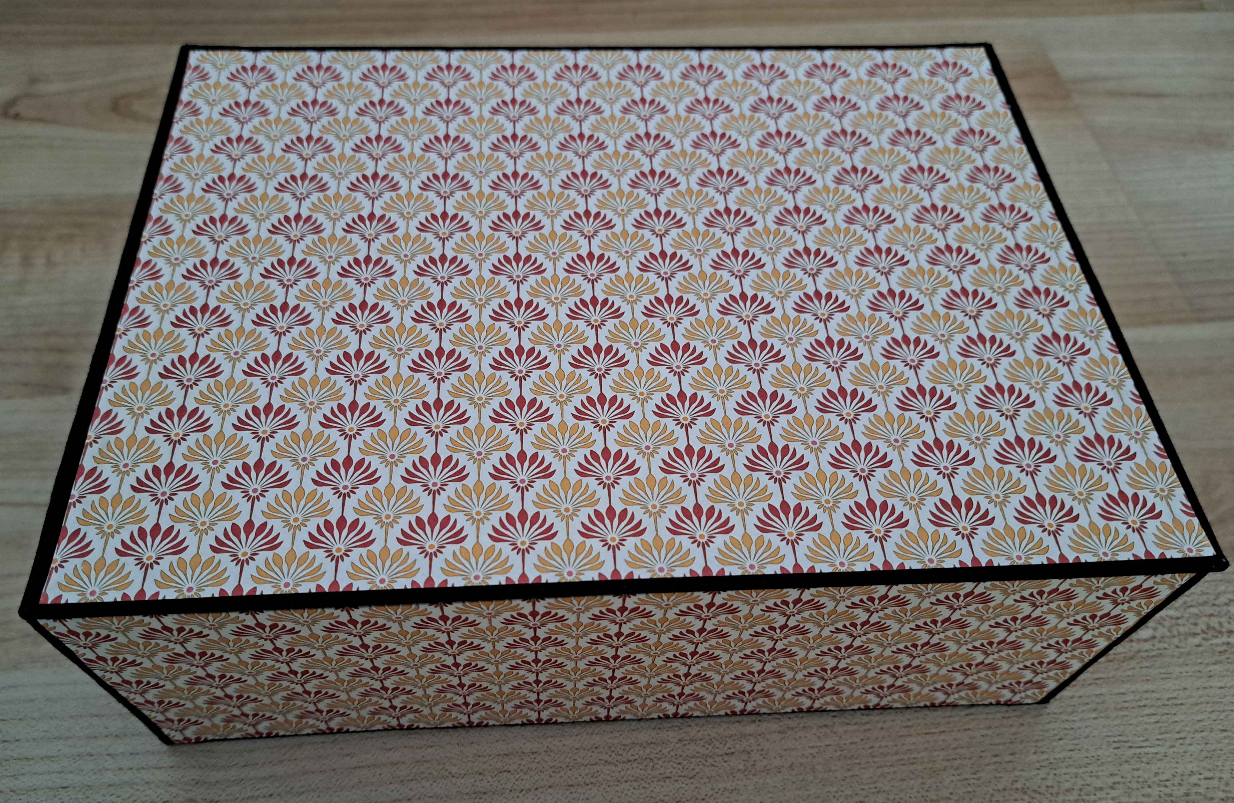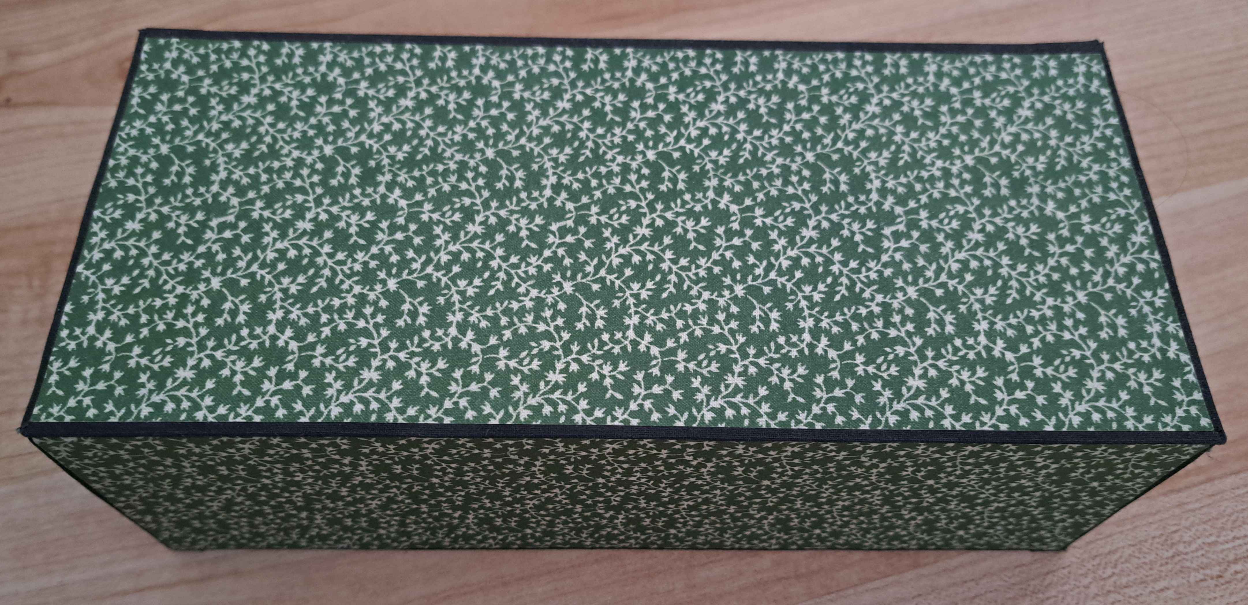 Die Schachteln werden alle aus Buchbinderpappe (grau geklebt, Stärke = 1,5 mm) zusammengesetzt und anschließend mit farblich passendem Gewebe eingebunden. Sowohl das Bezugspapier für außen, als auch für innen wird individuell zugeschnitten und anschließend mit Buchbinderleim befestigt. Außen wird gemustertes Papier (85-100g/m²) und für innen überwiegend Elefantenhaut* (110g/m²) verwendet.